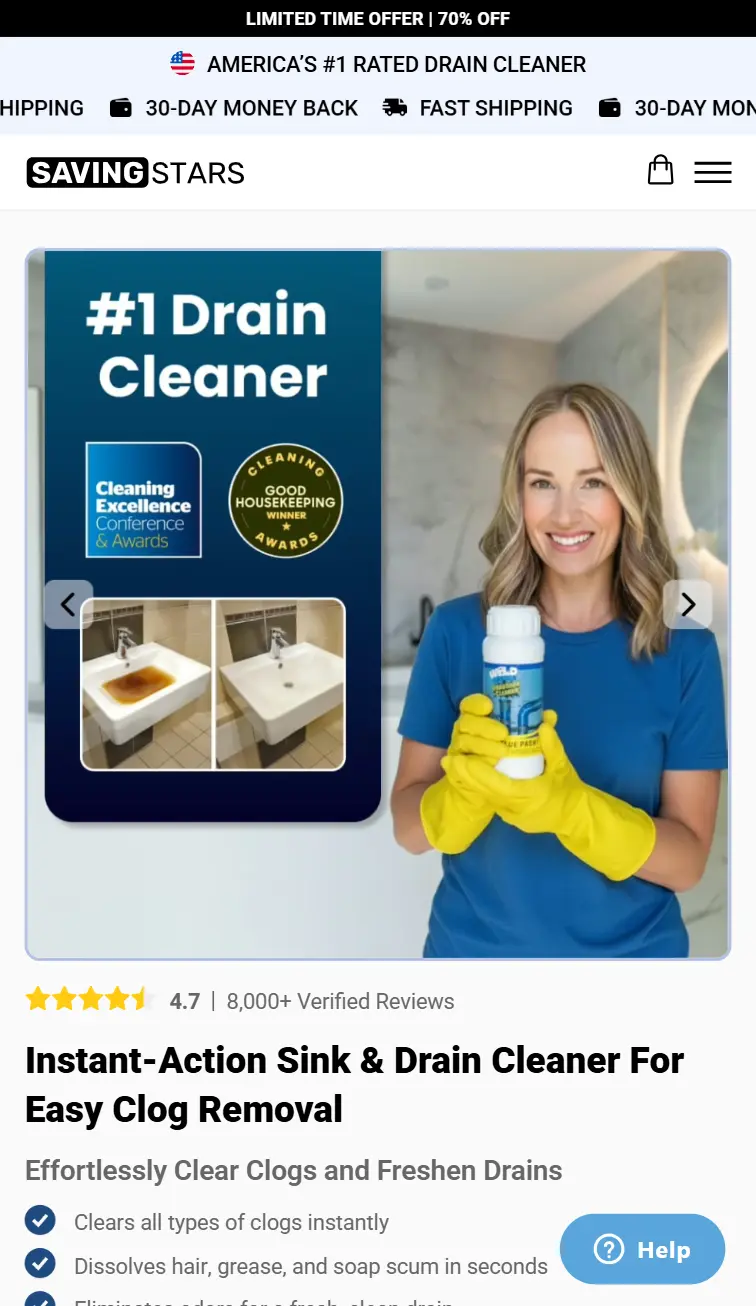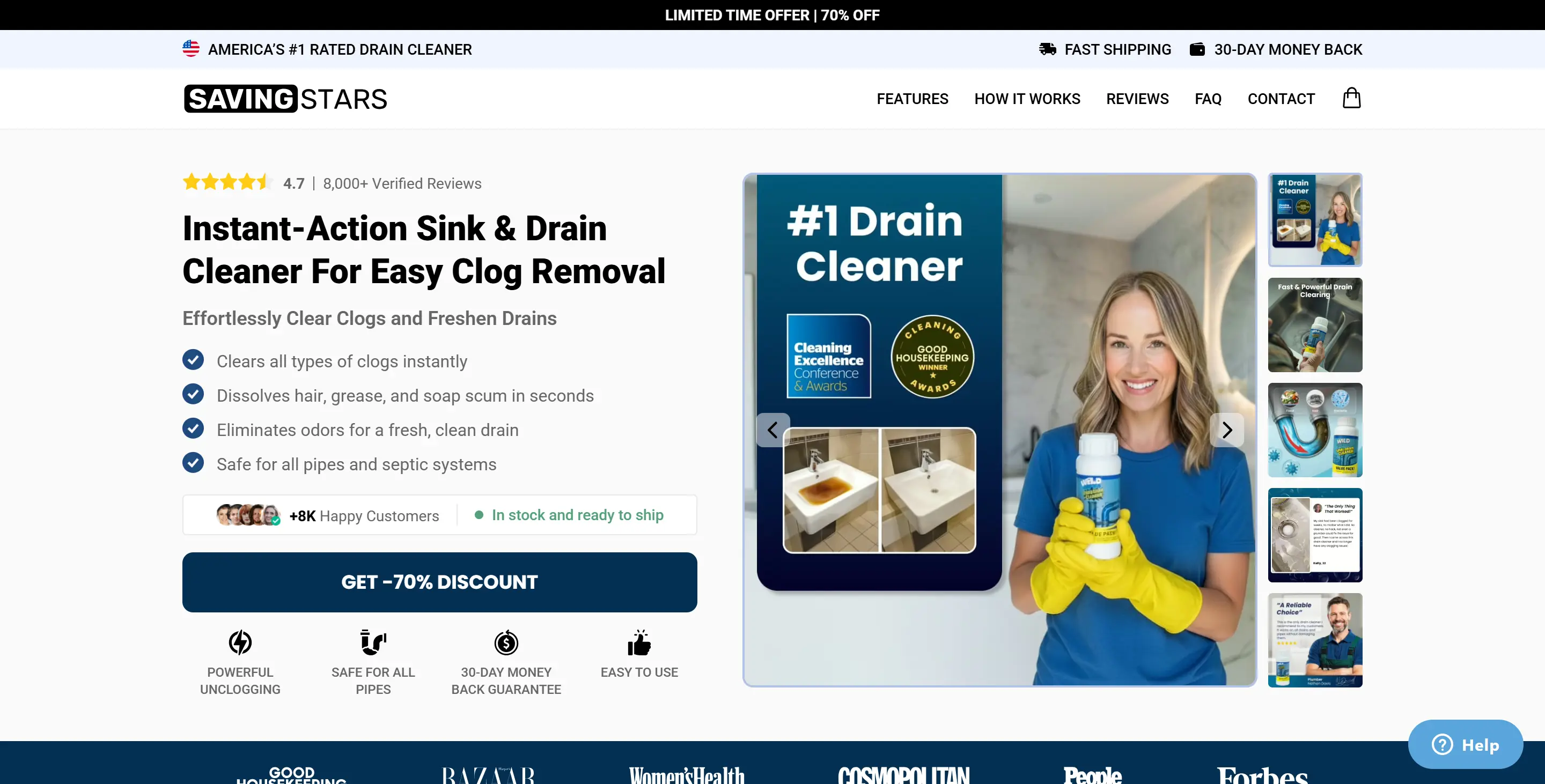 SavingStars Drain Cleaner is marketed as a fast-foaming powder designed to break down hair, grease, and soap scum while staying pipe-friendly. For current pricing, bundles, shipping, returns, and instructions, use the official site link below.